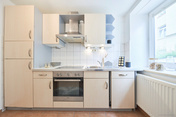 Nebenan befindet sich die Küche, welche mit einer Küchenzeile und allen wichtigen Elektrogeräten wie einem Geschirrspüler, einem Ceran-Kochfeld, einer Dunstabzugshaube und einem Kühlschrank mit Gefrierfachkombination ausgestattet ist. Ein kleiner Frühstückstisch findet ebenfalls Platz.