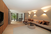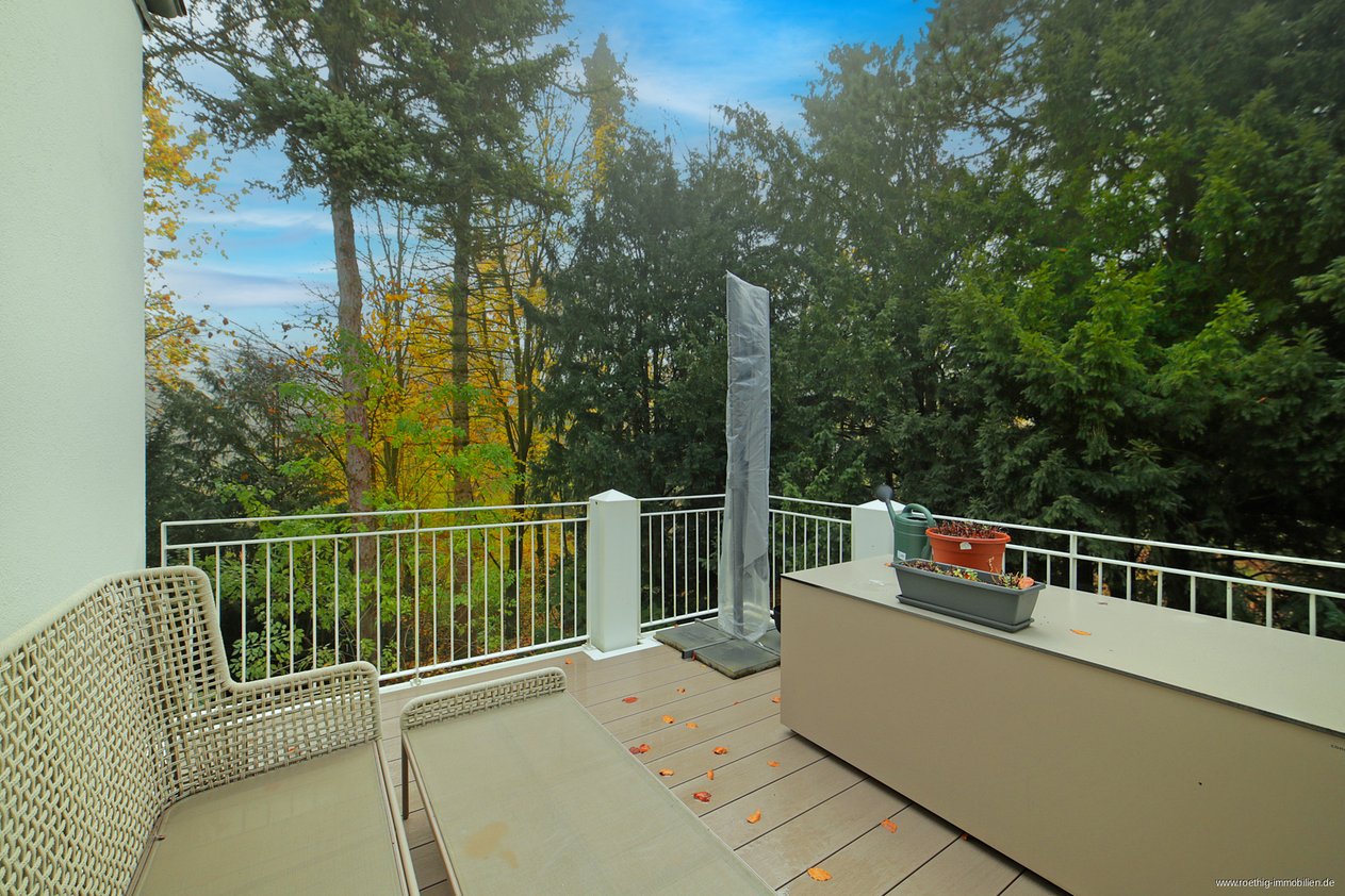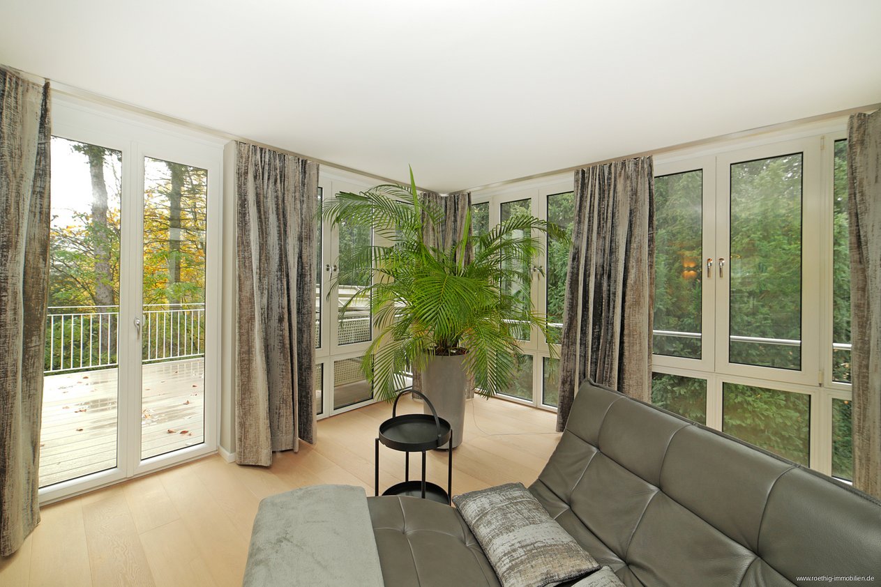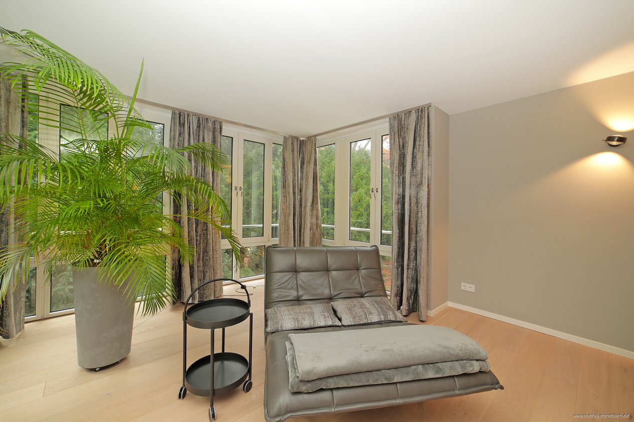Der weitläufige Wohnbereich beeindruckt durch seine Größe, den Blick ins Grüne und die bodentiefen Fenster, die für eine helle, freundliche Atmosphäre sorgen. Von hier aus haben Sie Zugang zur großzügigen Terrasse in Südostausrichtung mit bereits angebrachten Lichtquellen und Steckdosen – ideal, um entspannte Morgenstunden oder sonnige Nachmittage im Freien zu genießen.