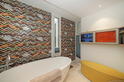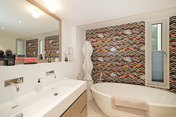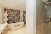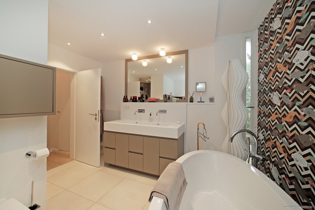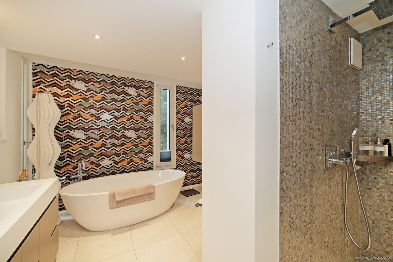 Das luxuriöse Badezimmer ist mit einer freistehenden Badewanne, einer bodentiefen Regendusche, Doppelwaschbecken mit Unterschrank, Fenstern und integrierten Deckenspots ausgestattet.