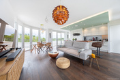 Die Wohnung verfügt über eine perfekte Aufteilung in Wohn- & Privatbereiche - sowohl für Singles, Paare oder Familien. Auf der linken Seite des Eingangsbereiches befindet sich der ca. 54 m² große, lichtdurchflutete Wohn-, Koch- & Essbereich – der stilvolle Mittelpunkt der Wohnung, geprägt von edlem, dunklem Parkett und weitläufigen Fensterfronten an der West- und Südostseite. Die raumhohen Verglasungen schaffen eine helle, einladende Atmosphäre zu jeder Tageszeit.