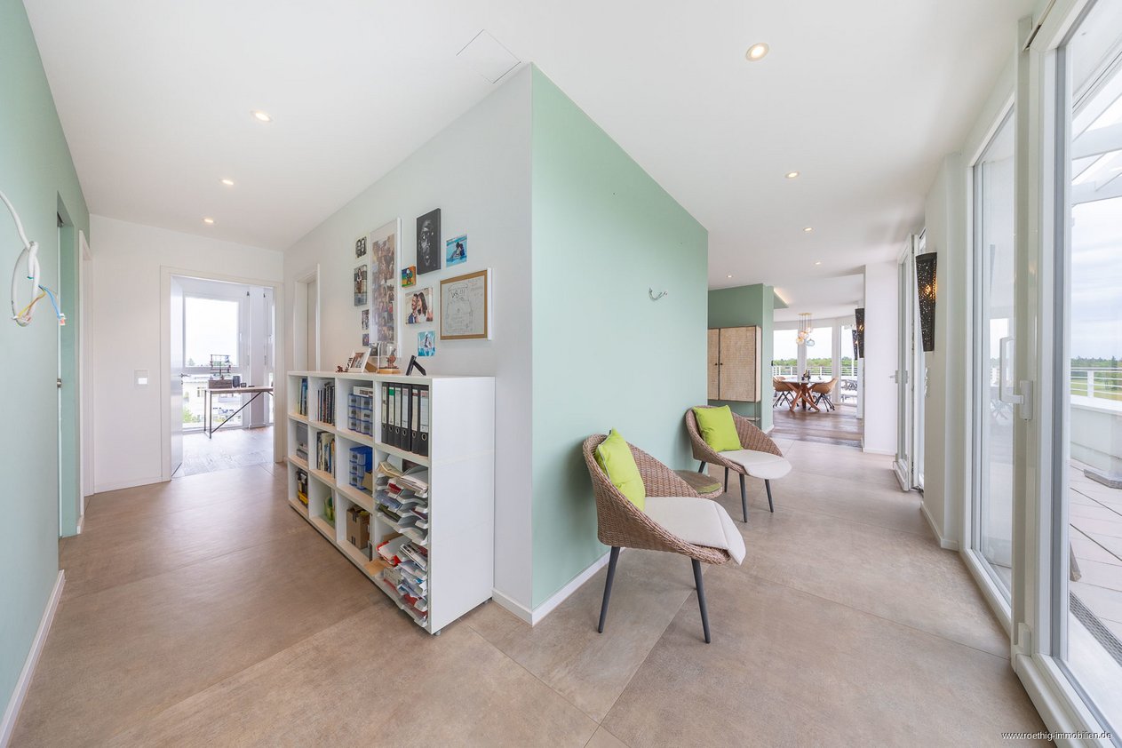 Die lichtdurchflutete Raumarchitektur ohne Dachschrägen, kombiniert mit großen Fensterelementen in alle Himmelsrichtungen, schafft eine Wohnatmosphäre von seltener Offenheit, Weite & Harmonie. Als alleinige Einheit auf der obersten Etage genießen Sie absolute Ruhe und maximale Privatsphäre – ohne jegliche Nachbareinsicht – sowie einen freien Blick ins Grüne.