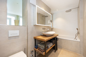 Über eine Milchglasschiebetür gelangen Sie in das stilvolle Badezimmer, das mit hochwertiger Markenausstattung von „Duravit“ und „Herzbach“ überzeugt. Durch Einsatz von Glaselementen wird der Raum in angenehmes Tageslicht getaucht und unterstreicht gemeinsam mit dem wellenartig gestalteten Wanddekor in warmem Beige das edle Ambiente. Ein maßgefertigter Schreiner-Waschtischunterschrank mit großzügigem LED-Spiegelschrank und einem eleganten Waschbecken von „Villeroy & Boch“ vereint Design & Funktion auf höchstem Niveau. Die Badewanne verfügt über eine ergonomische Anlehnfläche sowie praktische Ablageflächen und ist zusätzlich mit einer großzügigen Regendusche und einer separaten Handbrause ausgestattet.