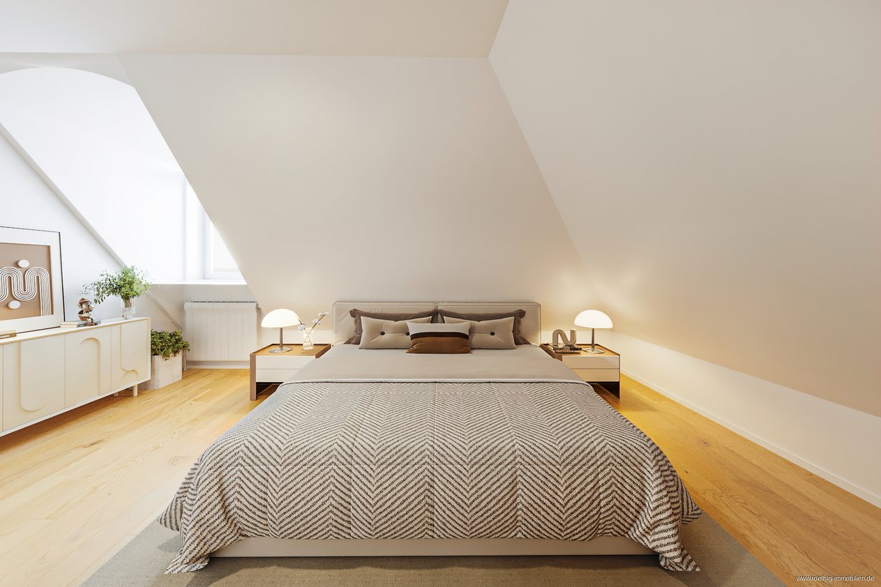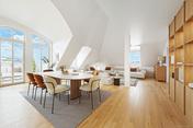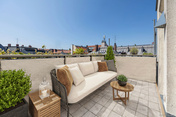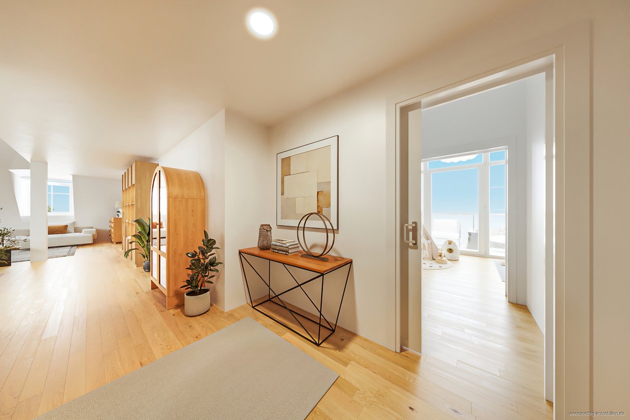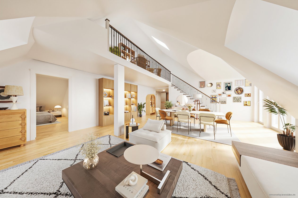 Die lichtdurchflutete Wohnung mit edlem Eichen-Echtholzparkett überzeugt durch eine durchdachte, harmonische Raumaufteilung: Auf der Westseite erwarten Sie die Küche sowie der großzügige Wohn- und Essbereich mit Zugang zu einem weitläufigen Balkon, der den Blick über die Dächer der Stadt eröffnet. Der östliche Teil der Wohnung bildet den abgeschlossenen Privatbereich mit den Schlafzimmern und Bädern. Ergänzt wird das Raumkonzept durch einen charmanten, halb-offenen Galeriebereich im Dachgeschoss, der sowohl über eine elegante Treppe im Wohnbereich als auch über das gemeinschaftliche Treppenhaus mit separatem Zugang erreichbar ist.