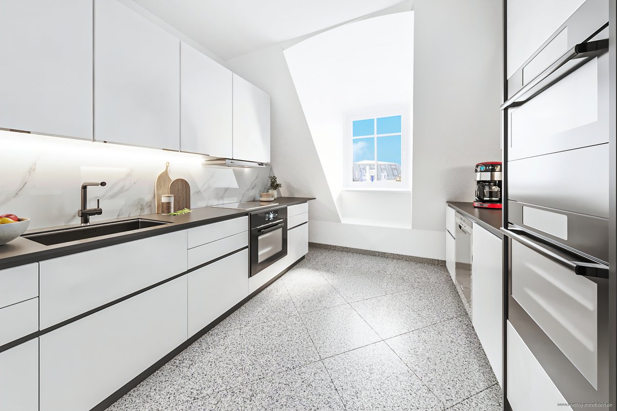 Zur Linken liegt die ca. 10 m² große Küche mit ihrer charmanten Westgaube, die den Raum in warmes Nachmittagslicht taucht. Sie bietet Ihnen die perfekte Grundlage, um Ihre Traumküche nach Ihren individuellen Vorstellungen zu gestalten – ob als geschlossene Einheit oder, wenn Sie es bevorzugen, offen (!) zum Wohnbereich mit eleganter Durchreiche.