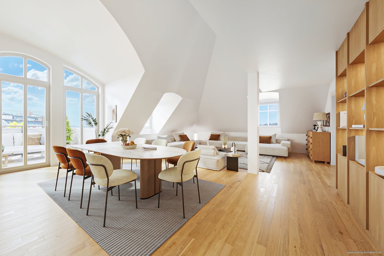 Auf zwei Etagen (5. Obergeschoss und Dachgeschoss) entfaltet sich hier ein außergewöhnliches Wohnkonzept mit einer Wohn-/Nutzfläche von rund 176 m². Bis zu vier Schlafzimmer (nach Umgestaltung des Galeriebereiches), zwei Balkone (Ausrichtung nach Westen und Osten), ein geräumiger Kellerraum sowie ein Tiefgaragen-Einzelstellplatz mit eigenem Grundbuchblatt sind nur einige der Vorzüge. Die großzügige Deckenhöhe von bis zu 4,6 Metern im Wohnbereich zum Galeriebereich verleiht dem Interieur eine luftige, offene Atmosphäre – und der Blick über die Dächer Münchens bis hin zur imposanten Paulskirche vom Ost-Balkon ist ein tägliche Freude.