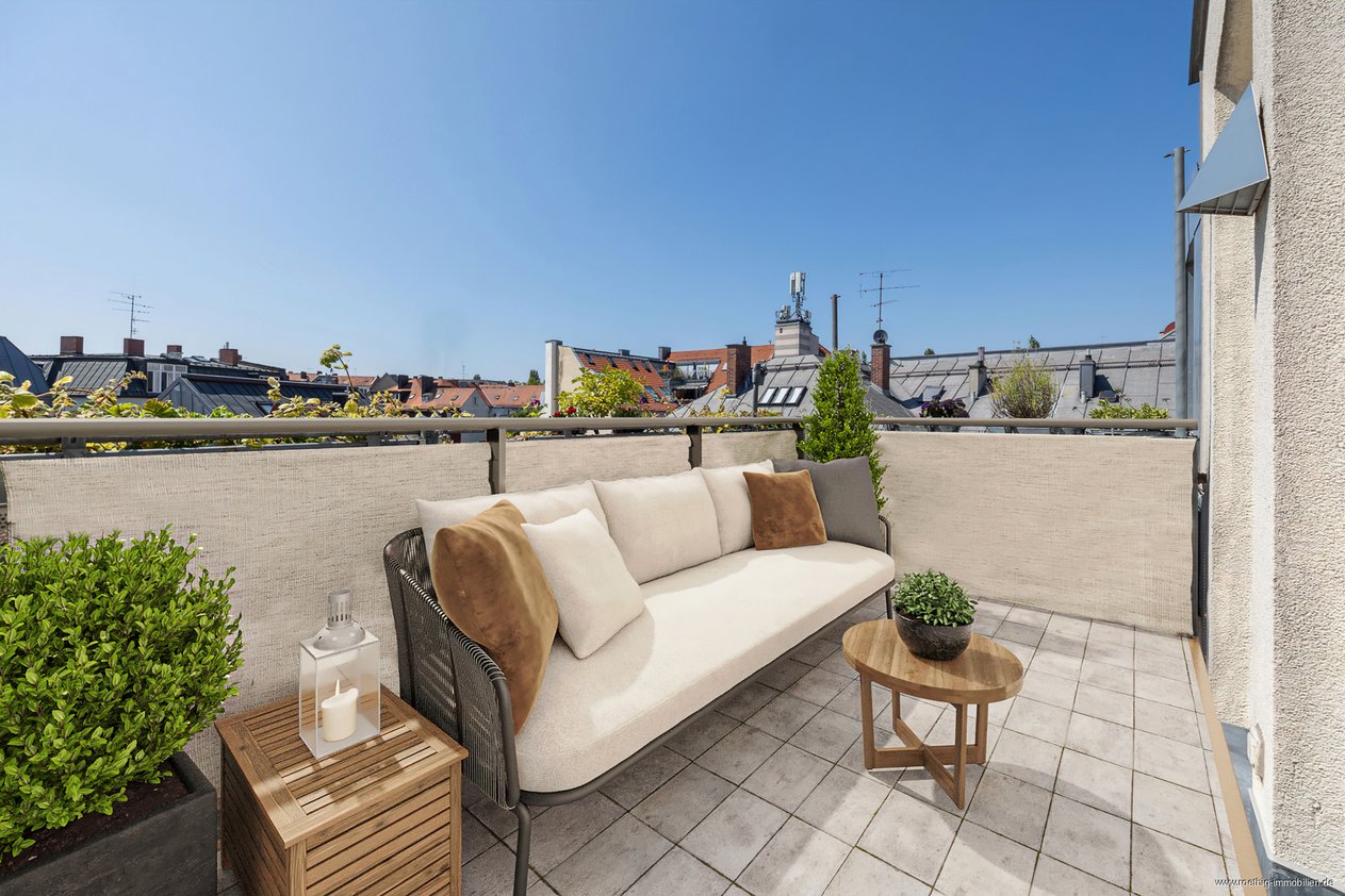 Ihr privater Rückzugsort im Freien: Der herrliche Westbalkon bietet Ihnen einen unvergleichlichen, weiten Blick über die Dächer Münchens – und das in geschützter Privatsphäre, fern von neugierigen Blicken. Dank der Ausstattung mit Licht- und Stromanschluss genießen Sie hier Komfort bis in die Abendstunden.