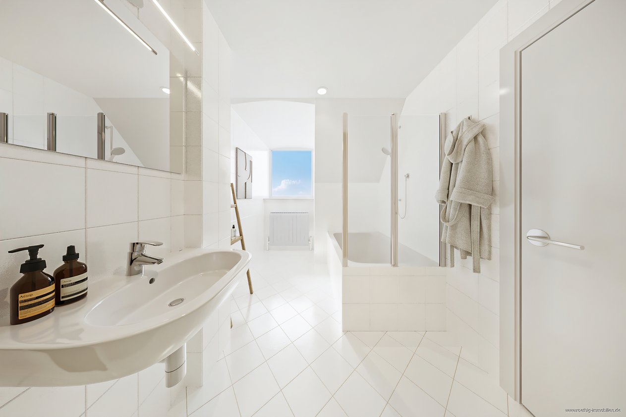 Das geräumige Badezimmer ist mit zwei Waschbecken, einer Toilette, einer Badewanne sowie zahlreichen Ablageflächen komfortabel ausgestattet. Eine große Ostgaube durchflutet den Raum mit Tageslicht und ermöglicht gleichzeitig eine angenehme Belüftung
