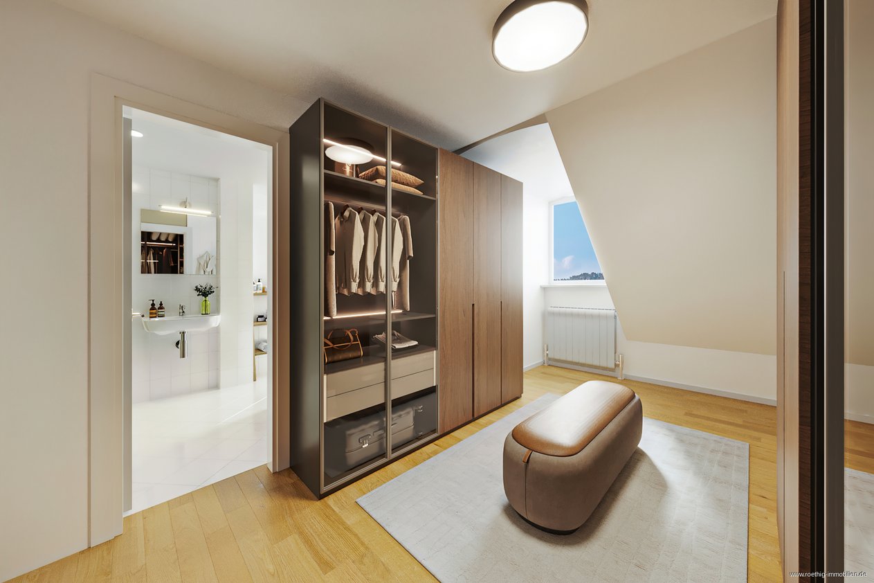 Ihr Master-Bedroom mit Bad en Suite ist wahlweise über den hinteren Wohnbereich oder über den abgetrennten Privattrakt mit angrenzender Ankleide am Wohnungseingang erreichbar.