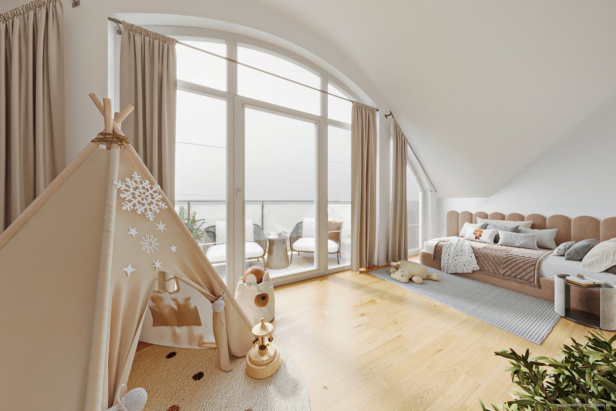 Ein weiteres Highlight ist zweifellos das zweite Kinder- oder Arbeitszimmer, das über einen eigenen Vorbereich und direkten Zugang zum Gästebad verfügt. Die beeindruckende, bodentiefe Fensterfront von fast fünf Metern Länge mit Zugang zum Ostbalkon vermittelt ein herrschaftliches Raumgefühl.