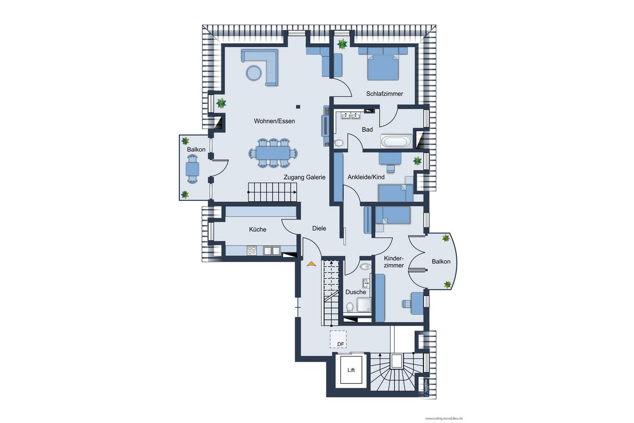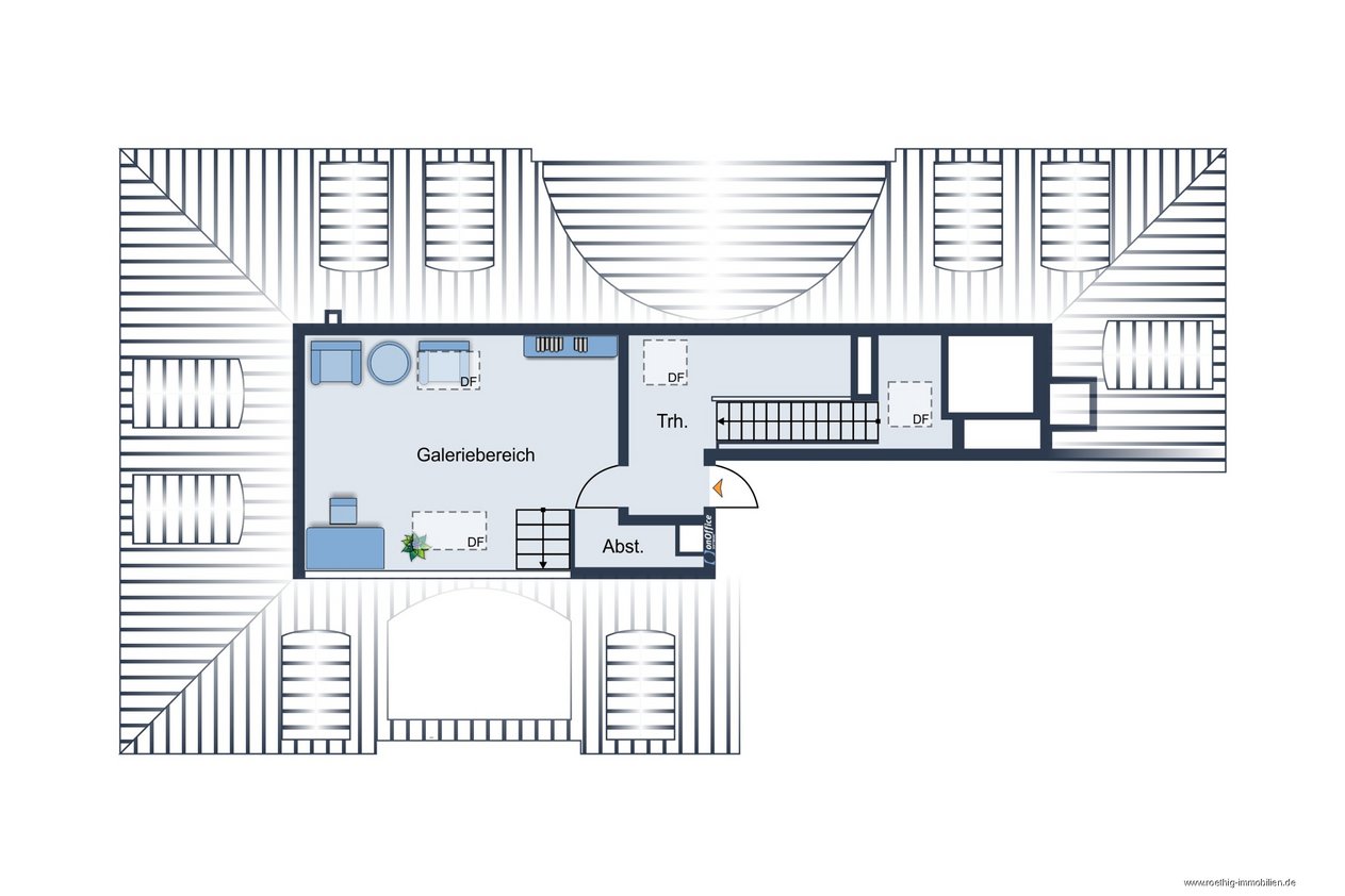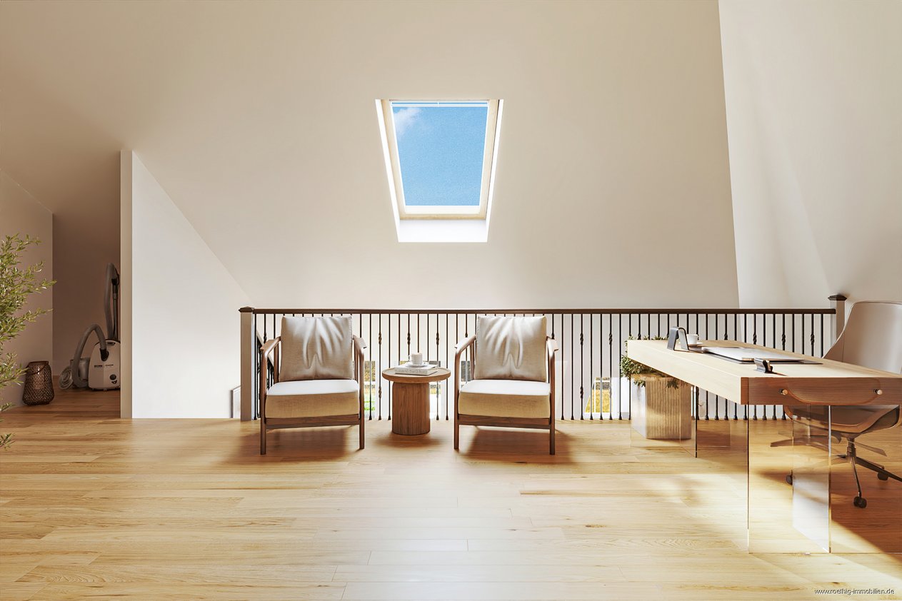 Über die im Wohnbereich integrierte Treppe gelangen Sie mit wenigen Stufen in den im Dachgeschoss thronenden, halb-offenen Galeriebereich mit ca. 21 m², welchen Sie je nach Bedarf nutzen können. Durch den zusätzlichen separaten Zugang vom Treppenhaus eignet er sich ideal als Gäste- oder Arbeitsbereich. Eine praktische Nische in der Ecke sorgt zudem für wertvollen zusätzlichen Stauraum.