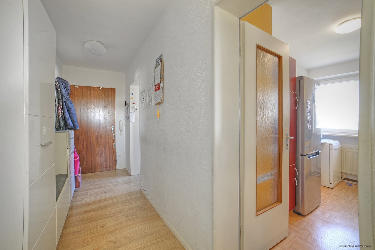 Nach Betreten der Eingangstür befindet man sich in der überaus geräumigen Diele, welche alle Räume der Wohnung zugänglich macht und genügend Platz für eine Garderobe bietet. Ein praktischer Einbauschrank mit viel Stauraum ist hier bereits verbaut.