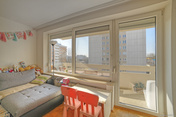 Das erste Zimmer auf der linken Seite eignet sich ideal als Kinder- oder als Arbeitszimmer. Ein Bett sowie ein Schrank können problemlos platziert werden. Durch ein großes Fenster wirkt der Raum hell und freundlich, kann aber bei Bedarf durch Rollläden abgedunkelt werden.