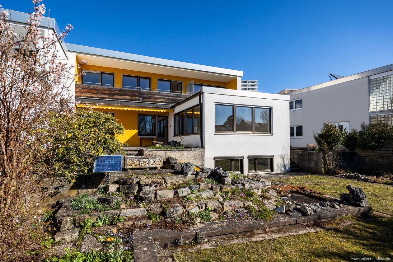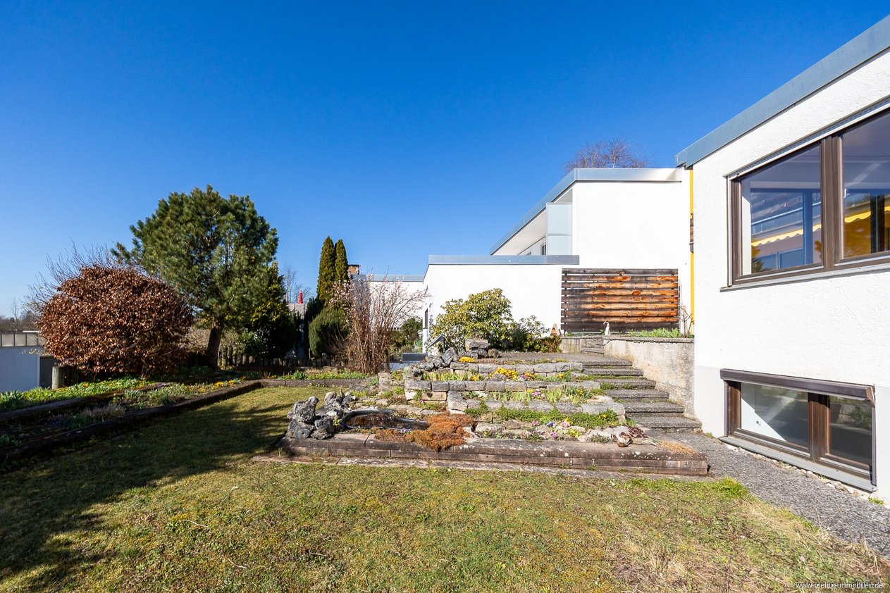 Die angenehme Hanglage des beeindruckenden Hauses ermöglicht lichtdurchflutete Räume in allen Geschossen und schafft durch die elegante Split-Level-Architektur auf mehreren Erdgeschossebenen ein spannendes, offenes Raumgefühl. Die vom Bauherren sorgfältig geplante Süd-/Westausrichtung der großflächigen Fenster mit teilweise elektrischen Rolläden, des Gartens, der Terrasse und des Balkons schafft ganztägig sonnenverwöhnte Wohn- & Aufenthaltsbereiche – innen wie außen – mit idyllischem Weitblick ins Grüne.