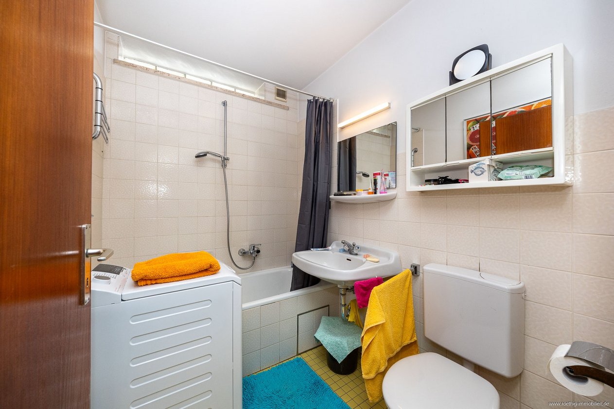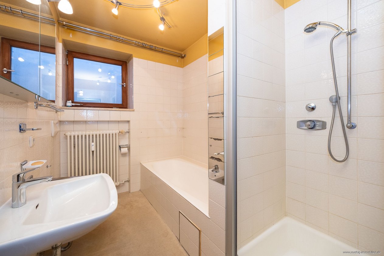 Das großzügige Tageslichtbad mit breitem Fenster zum grünen Vorgarten, ist mit Badewanne, Dusche und Waschbecken ausgestattet, während zudem ein separates WC & ein Abstellraum zusätzlich vorhanden sind.