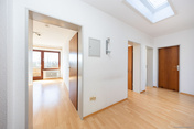 Das Eingangsgeschoss präsentiert sich auf der Vorderseite des Hauses ebenerdig, während es sich auf der Rückseite dank der Hanglage als luftiges Obergeschoss mit Balkon & weitem Blick ins Grüne öffnet. Hier befindet sich der private Familienbereich mit drei gleichwertig geschnittenen Kinder- oder Arbeitsbereichen, einem Tageslichtbad, einem WC sowie Garderobe & Abstellflächen. Zur linken Seite eröffnet eine Treppe den Zugang zu den weiteren Ebenen Ihres neuen Zuhauses, während eine weitere Tür die Räumlichkeiten dieser Etage samt breitem Flur mit Oberlichtern erschließt.