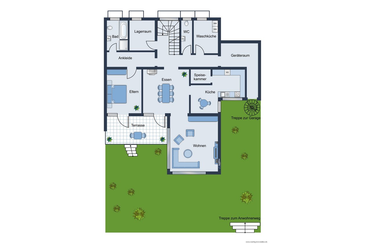 Schon beim Nachhausekommen werden Sie von einem liebevoll gestalteten Vorgarten mit Wasseranschluss empfangen, der dem Anwesen eine einladende Atmosphäre verleiht.