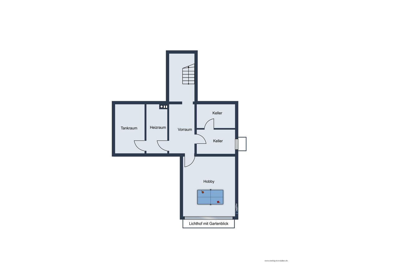 Das geräumige Untergeschoss des Hauses fasst neben zwei Kellerräumen und dem Heizungsraum einen großzügig gestalteten Hobbybereich. Das ca. 13 m² große Souterrainbereich präsentiert sich in Wohnraumqualität und eröffnet vielseitige Nutzungsmöglichkeiten – sei es als stilvolles Homeoffice, komfortabler Gästebereich oder privater Rückzugsort. Die ca. 3,50 m breite Fensterfront zum Lichthof sorgt für ein angenehmes Maß an Tageslicht und gewährt einen reizvollen Blick in den Garten.